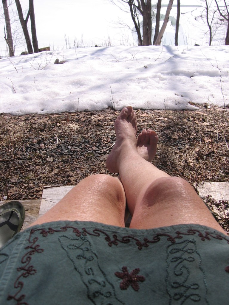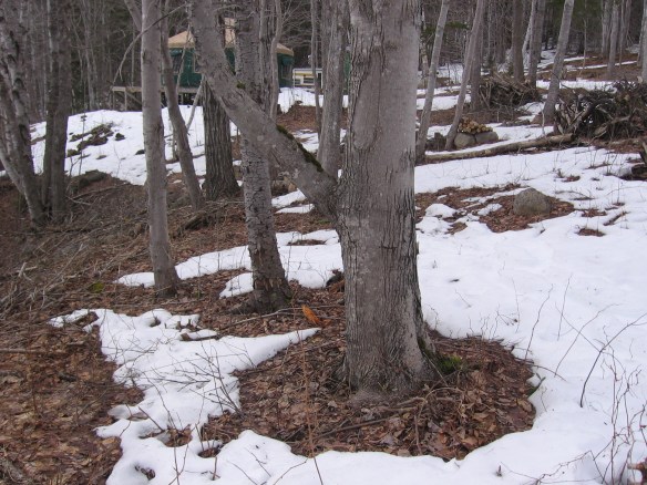 Any dark object illustrates the power of the albedo effect. A pile of frozen moose poop sets off a ring of snowmelt. Twigs, spruce needles, old leaves; all absorb the sun’s heat and sink into the snow as it melts beneath them. When you see a speck of stump or boulder or wood pile emerge, watch the albedo effect in action as the snow melts more rapidly from that spot, exposing more dark surface, absorbing yet more sunlight, melting yet more snow. The positive feedback loop is underway. The rate of melt is accelerating.