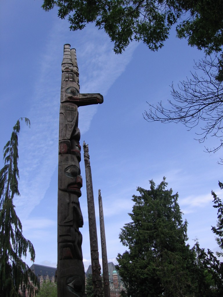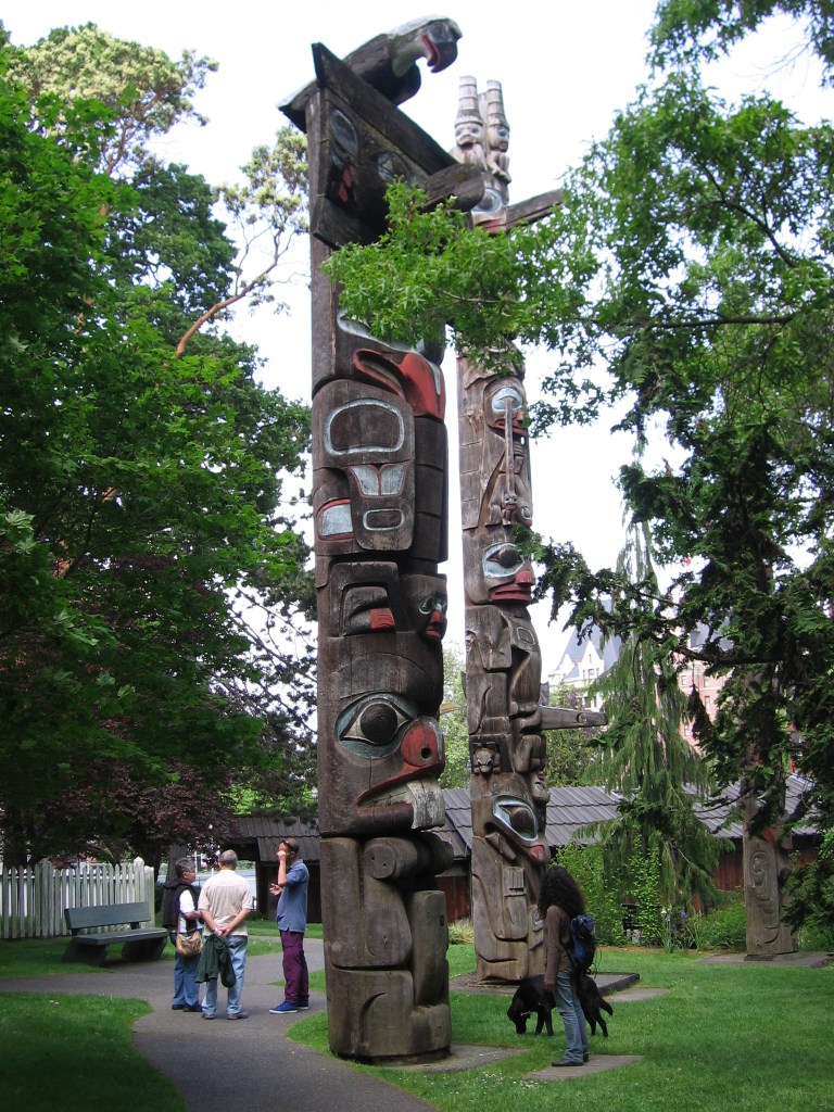 Along with the usual telephone and light poles, west-coast gulls can perch on a far more impressive pole. Thunderbird Park features an array of totem poles. My daughter-in-law and I were looking up, way up, admiring the magnificent carvings, when we burst into laughter. A seagull was perched on the very top of the totem pole, higher than Eagle or Raven or even the mighty Thunderbird, surveying the world below like the lord of all creation.