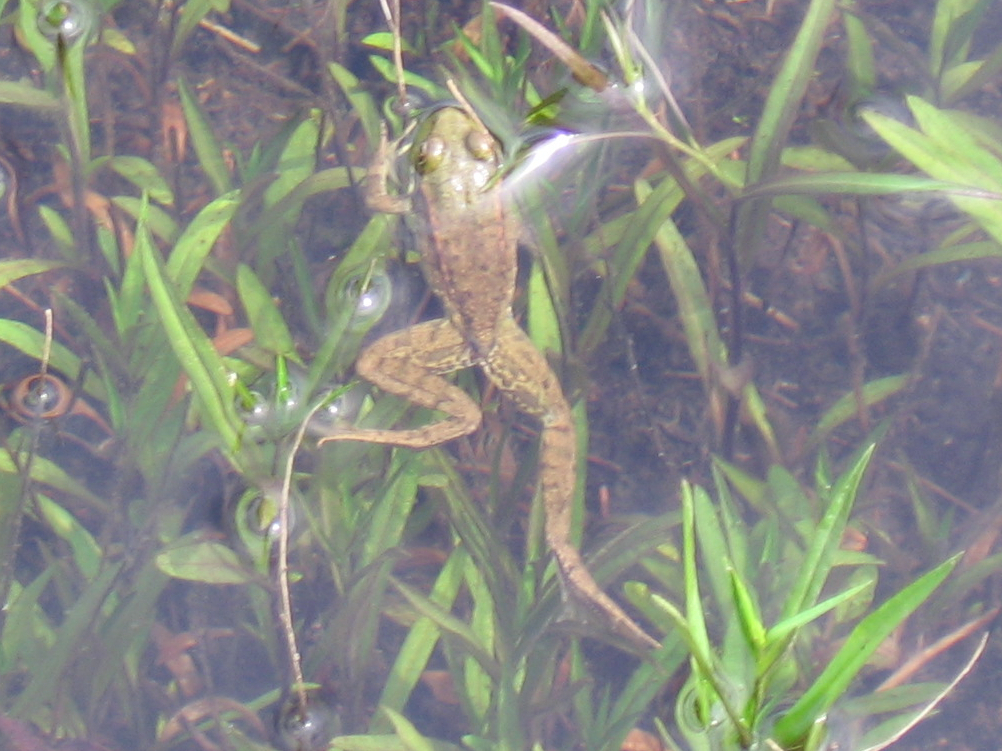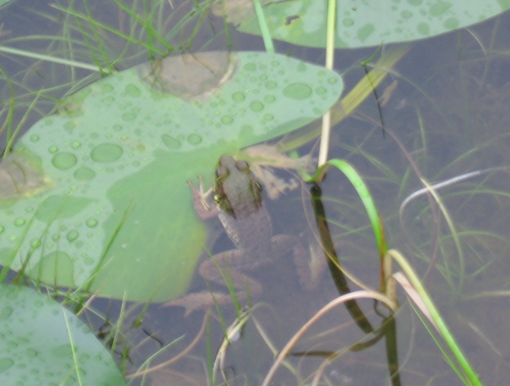 Now it is August and the pond has once again drained to levels too shallow for homo sapiens swimmers. It’s only fit for frogs and bugs and snakes and newts and for the ducks, sandpipers, kingfishers and such that feed on them. The frogs are content, with a surface cover of lily pads to keep them shaded and hidden from predators, and lots of lovely silty detritus on the bottom.