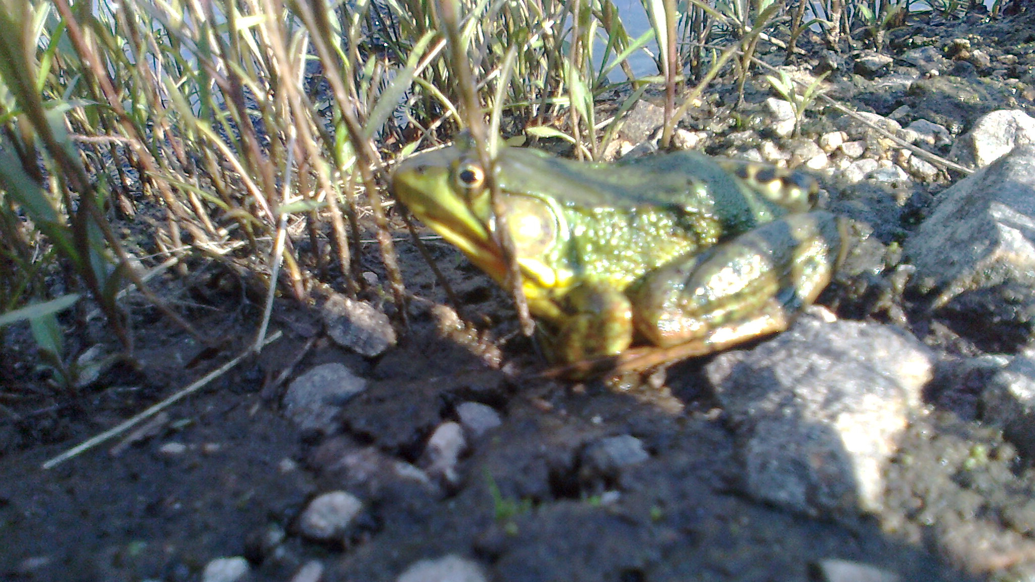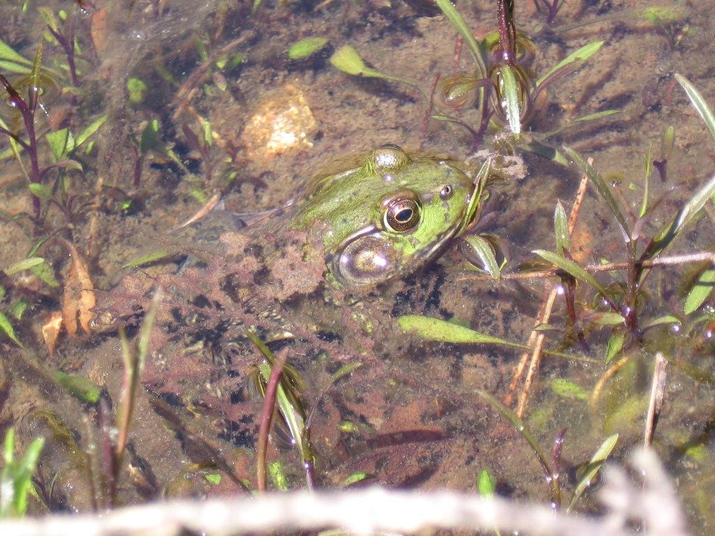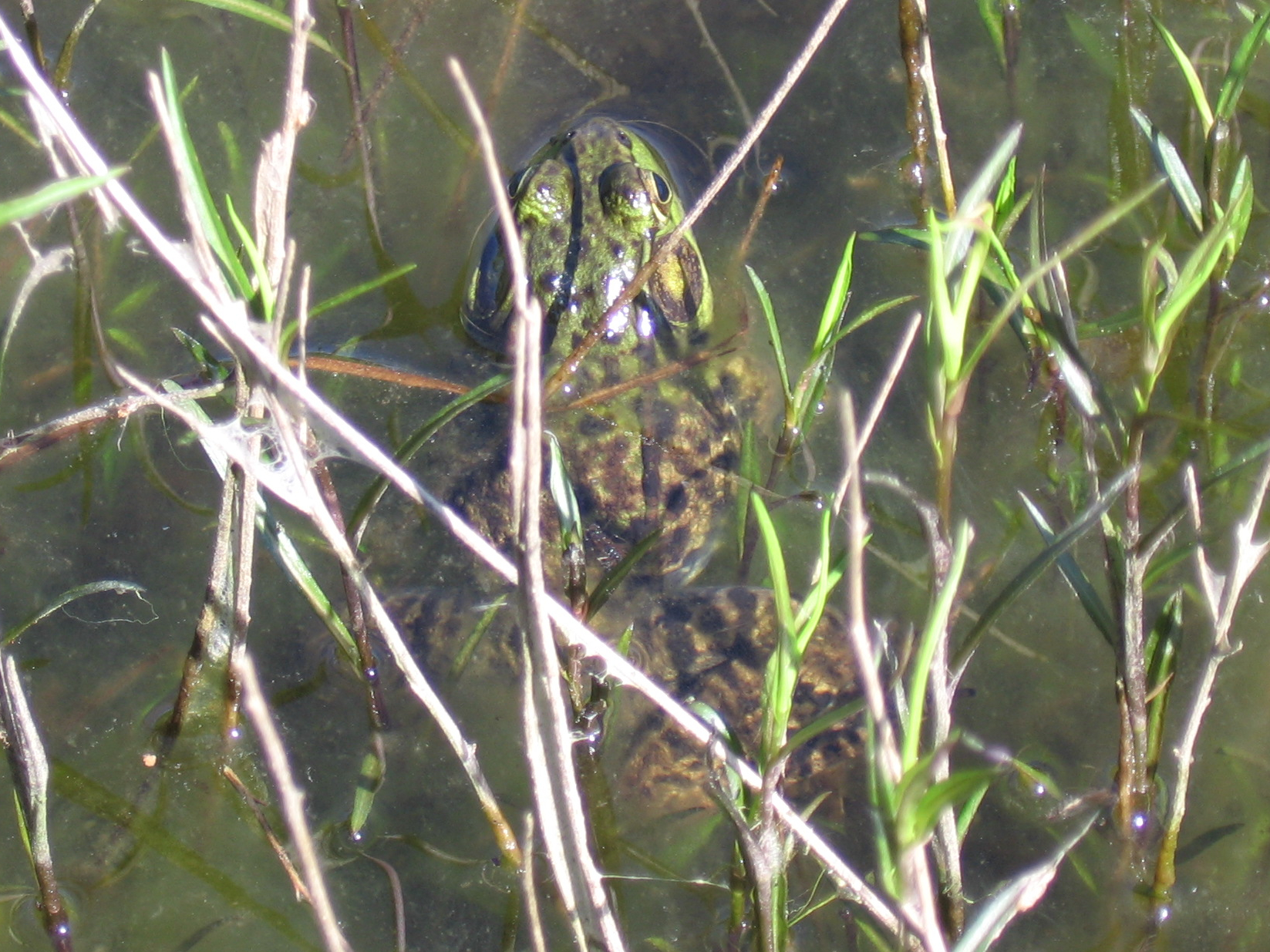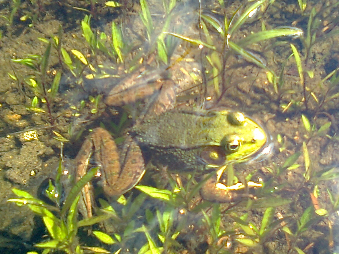 I hauled my pond gear through the brush and out to the gravel point, which was mostly submerged. I set down my chair and beach bag and was gazing around, trying to decide where to get in, when – Eek! There he was! He was big. He was green. He was a Green Frog. And he was just. Right. There.