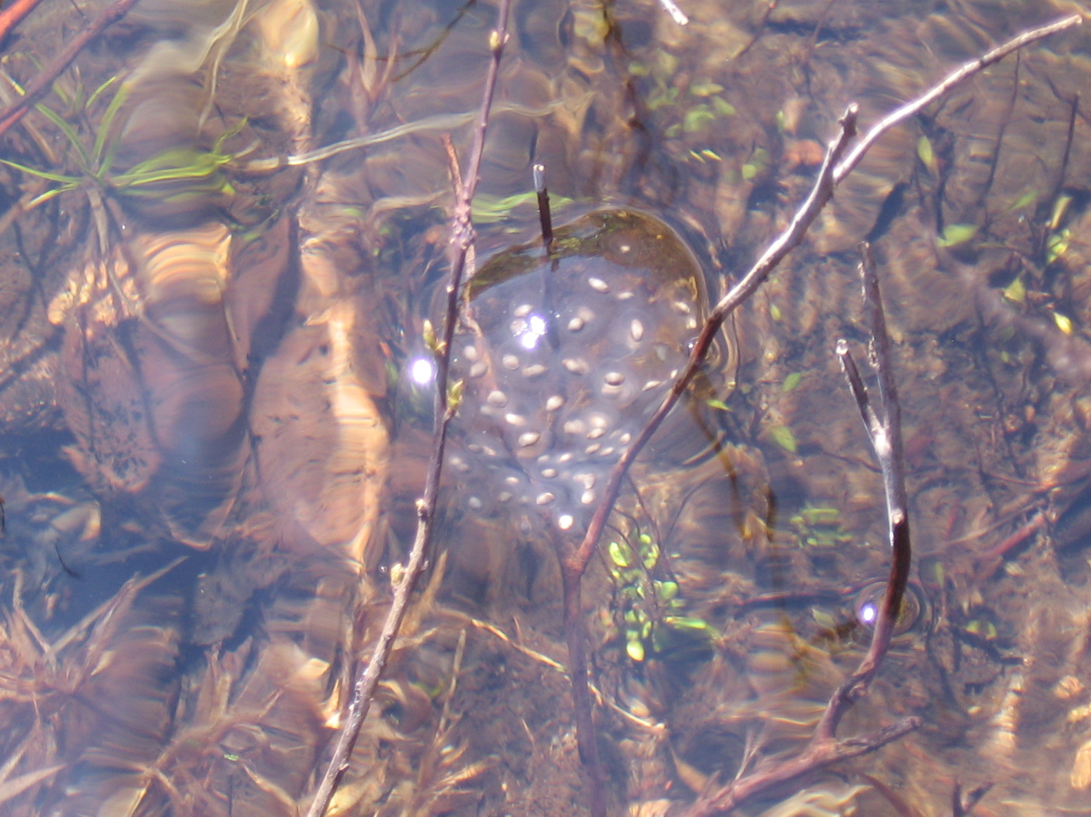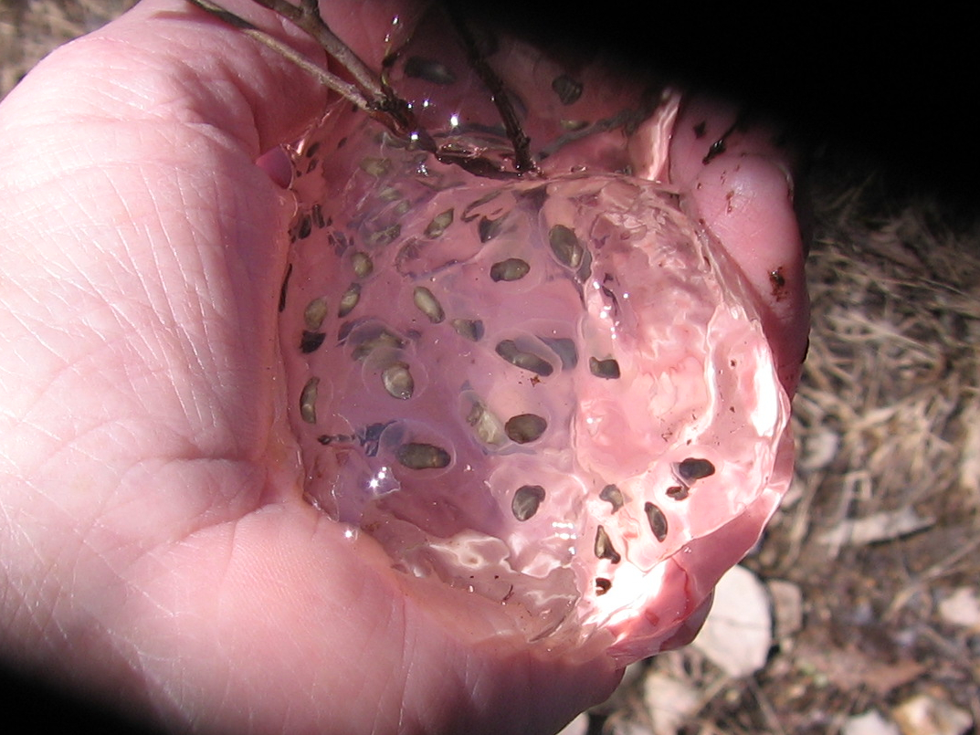 Living with frogs has given me the opportunity to observe this fascinating journey at various ages and stages. The cycle begins soon after spring melt, as described in Funky Frogs, and carries on with matching and hatching, as I posted in Frogs, Globs, and Pollywogs. The female lays jellied egg masses attached to twigs underwater. That’s it for maternal care from mama. She just lays lots of eggs and lets nature – natural selection that is – take its course. As pond levels drop, these egg blobs can be stranded high and dry, like the one I’m holding. By this time I can see the embryos wiggling around in their egg sacs and feeding on the algae that colours the eggs green. I put stranded blobs back in the water to give the wee ones a shot at survival.