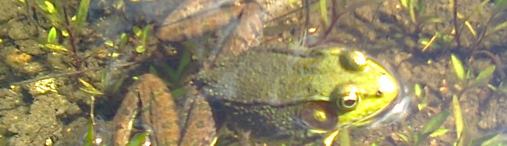 Green frogs are the biggest frogs we have here in Cape Breton. (We don’t, so far as I can determine, have bull frogs on the island.) I wrote about them and other frog species last June, but here’s the recap. The tadpoles take two years to mature and by their second year are bigger than some frog species will ever be. The tads are bizarre looking creatures. To quote myself, they ‘look positively freaky, a kind of FrankenFrog with a full-sized frog-head attached to a tadpole-tail but no torso. Seeing dozens of these scatter in the shallows is a strange sight indeed.’
