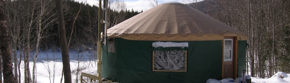 Living in the yurt was like camping out in a big, luxurious tent. I was off-grid with no running water. I heated with wood and lit with kerosene lamps. I was too far back from the road to be plowed out, so I snowshoed in and out in winter, hauling in food and water. The yurt was easy enough to heat with the big wood-cook stove; but it didn’t hold the heat so it was bitterly cold on winter mornings. How cold? One morning my bedside water bottle was frozen solid. It was -10C inside. I learned to put the coffee water in the kettle the night before, since the spigot on the water jug would freeze overnight.
