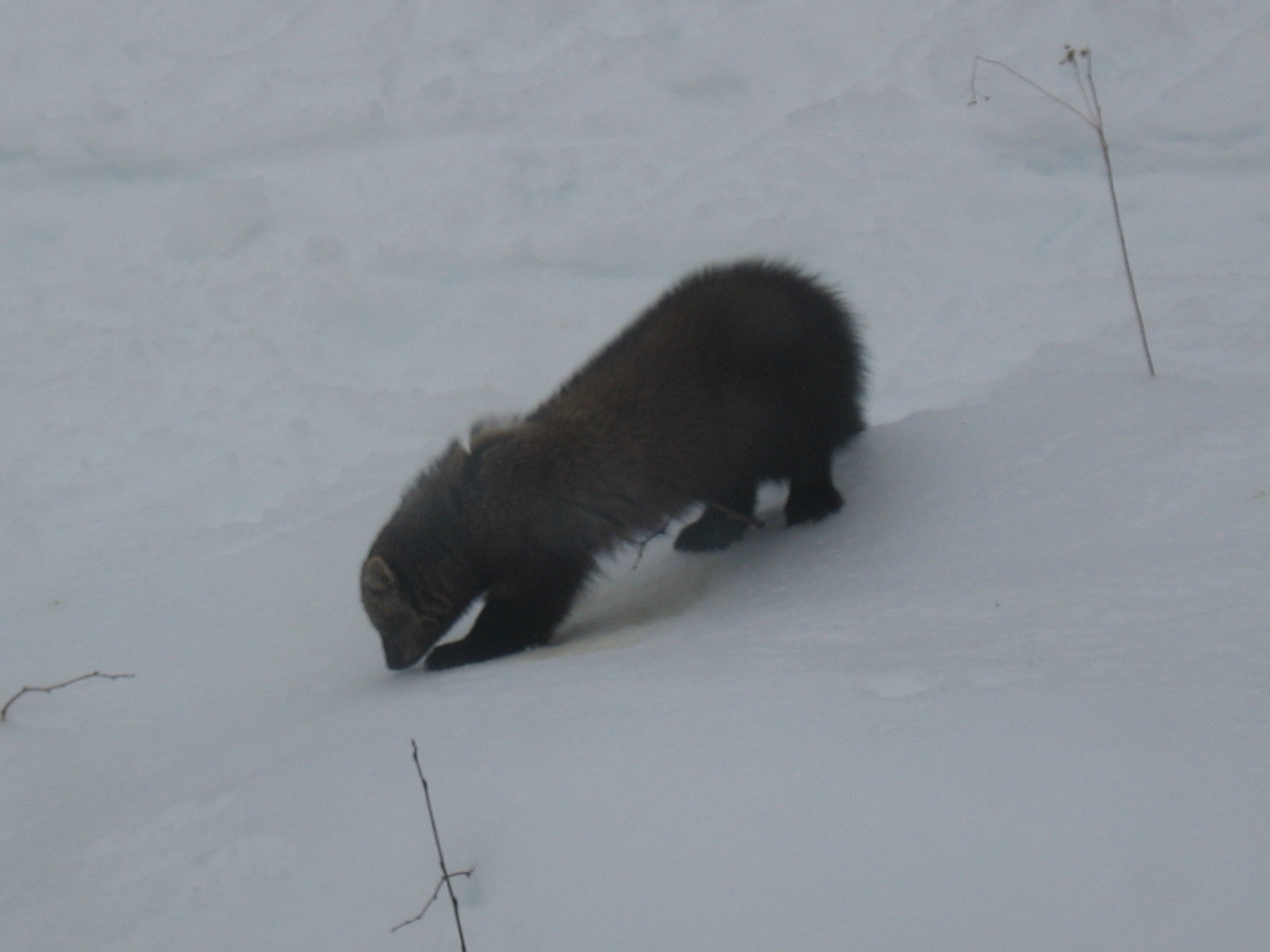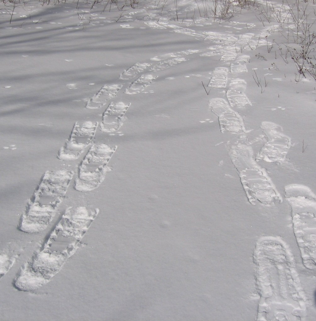 By chance I found myself following in the footsteps, so to speak, of these two coyotes on my way back home. We all took the same route away from the river and through the woods, but I parted ways when their tracks went straight up a very steep slope. I was almost home when I crossed their paths again. The coyote tracks went up the hill through the forest – and then out onto the old wood road above my house. This was the same coyote pair I’d started tracking when I first set out. I’d come full circle. Perfect! It was the best snowshoe I’d had in a couple of winters.