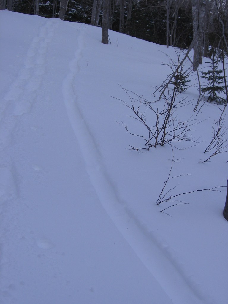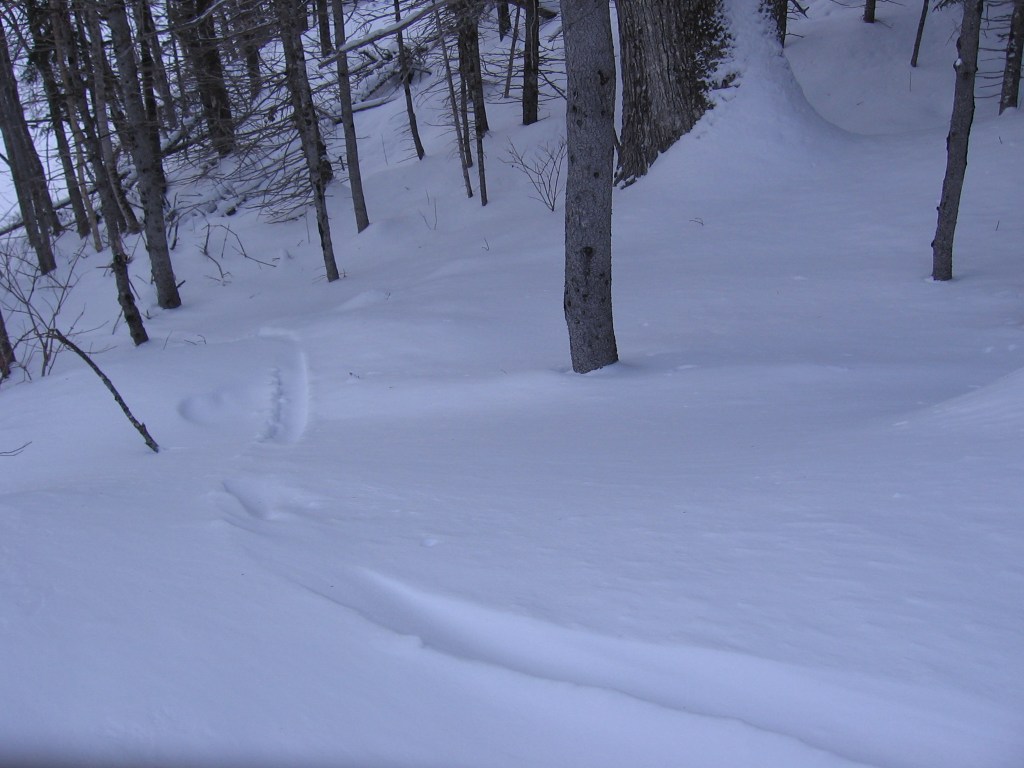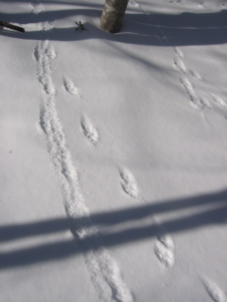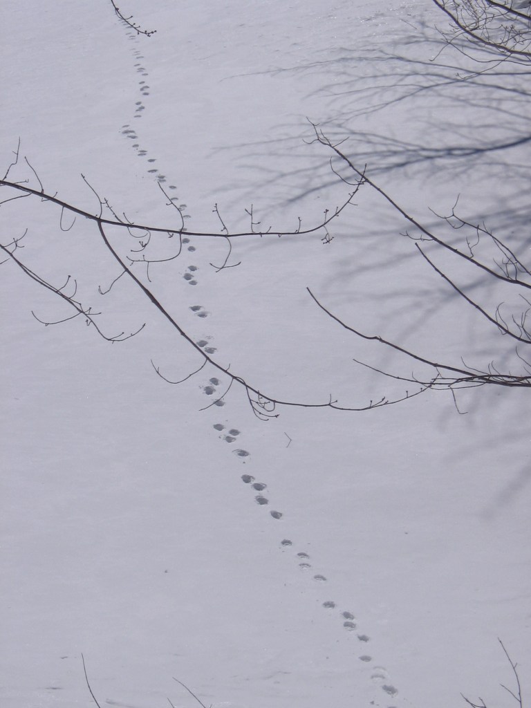 We haven’t had much snow this year, but as I wrote in The Secret Lives of Animals, my winter joy is strapping on my snowshoes and following animal tracks. With warm weather on the way I took advantage of a sunny afternoon in mid-March and went snowshoeing up the hill behind my house along an old wood road. I hadn’t gone far when I saw fresh tracks – first a pair of coyotes, then a moose. I followed the tracks up until they all fed into a narrow trail I’d cut through new growth blocking the road. I was pretty chuffed that the critters were using my trail, but it was too narrow for snowshoes, so I headed back down, past some grouse tracks. (These photos were taken a couple of days later, hence not-so-fresh or clear, and with human tracks alongside. They’re a bit better full size.)