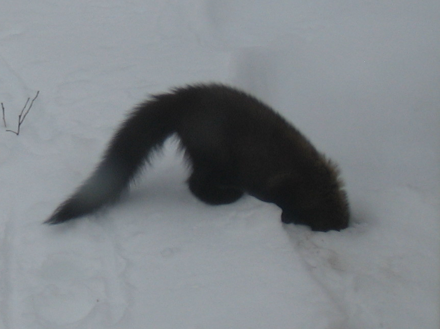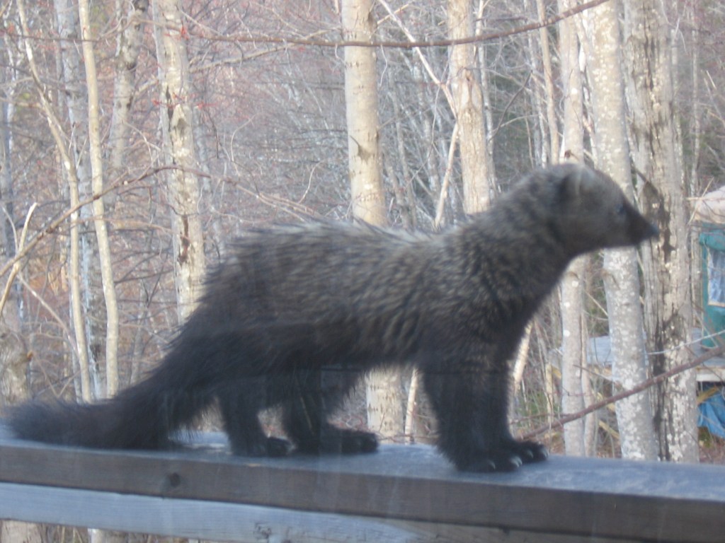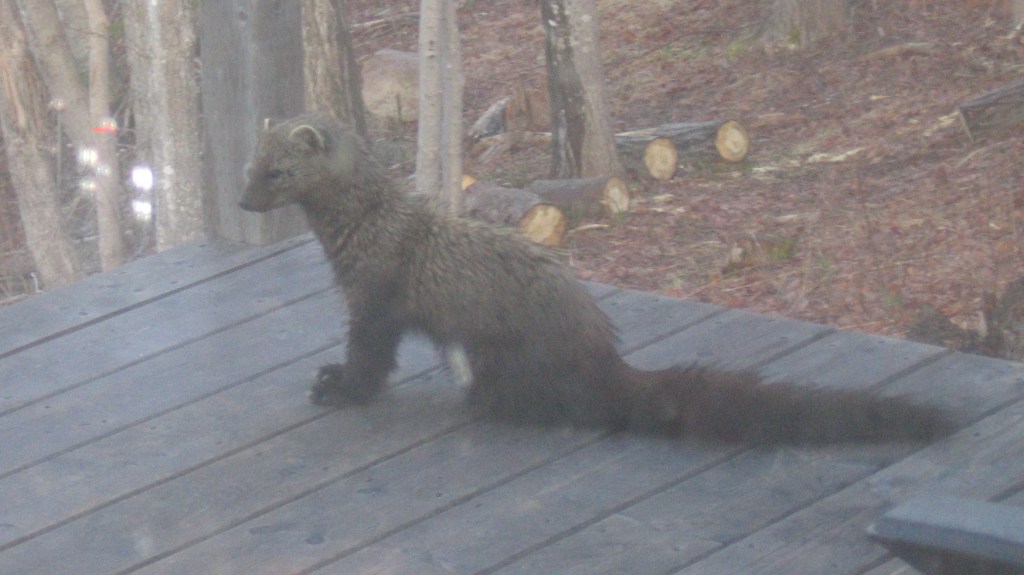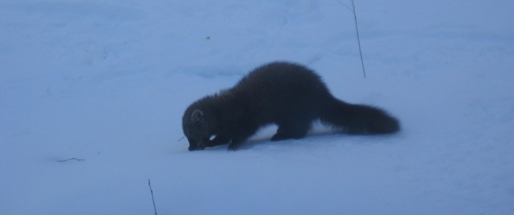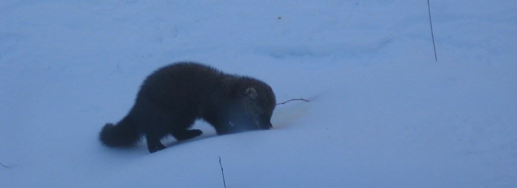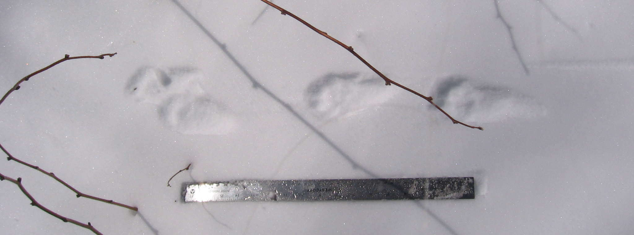 We haven’t had much snow this year, but as I wrote in The Secret Lives of Animals, my winter joy is strapping on my snowshoes and following animal tracks. With warm weather on the way I took advantage of a sunny afternoon in mid-March and went snowshoeing up the hill behind my house along an old wood road. I hadn’t gone far when I saw fresh tracks – first a pair of coyotes, then a moose. I followed the tracks up until they all fed into a narrow trail I’d cut through new growth blocking the road. I was pretty chuffed that the critters were using my trail, but it was too narrow for snowshoes, so I headed back down, past some grouse tracks. (These photos were taken a couple of days later, hence not-so-fresh or clear, and with human tracks alongside. They’re a bit better full size.)